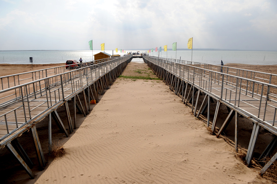 红碱淖水面以每年60厘米的速度下降,水线不断后退,近水的码头也在不断的延伸