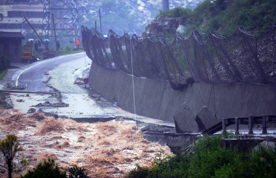 7月3日,213国道映秀至汶川段的一处塌方处,道路被洪水冲毁。当日,连接成都与汶川的“生命线”213国道,..