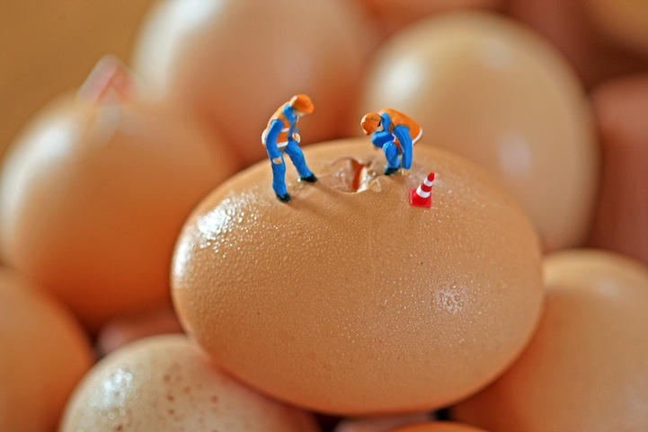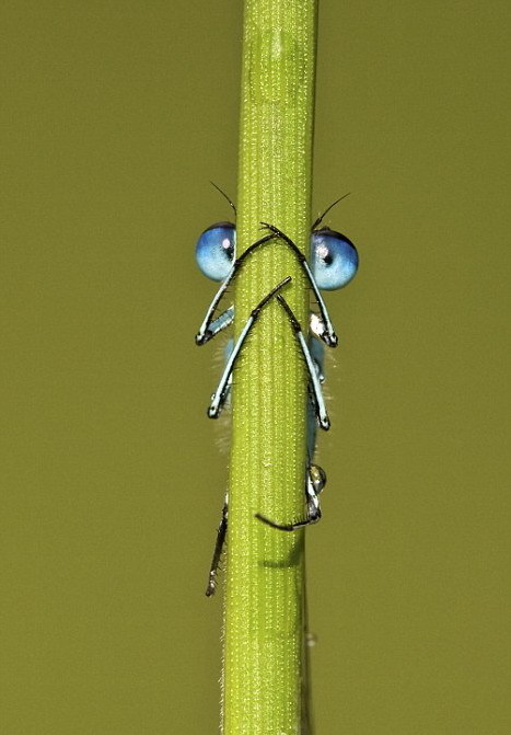 摄影师抓拍蓝豆娘紧抓小草躲藏照片